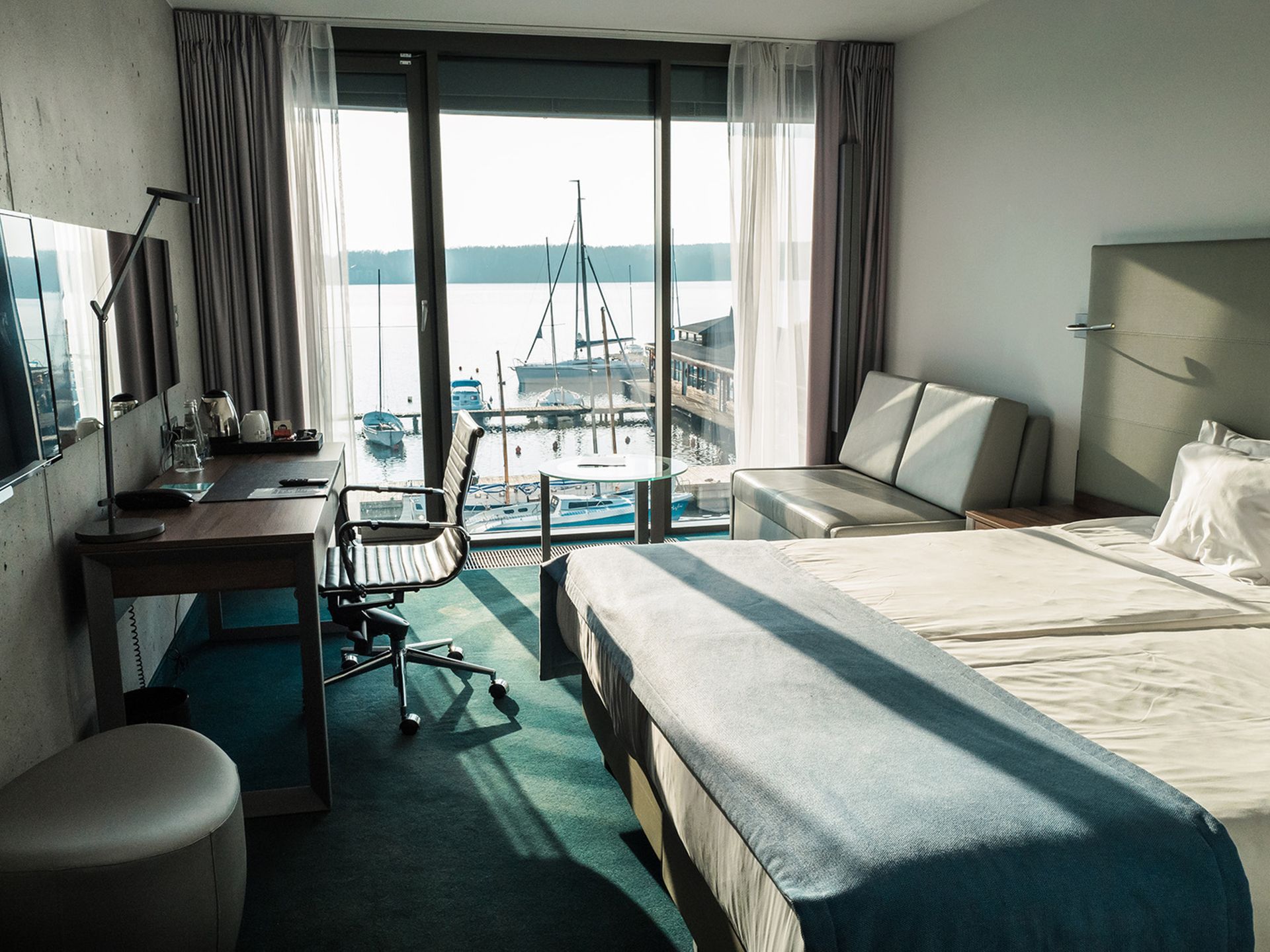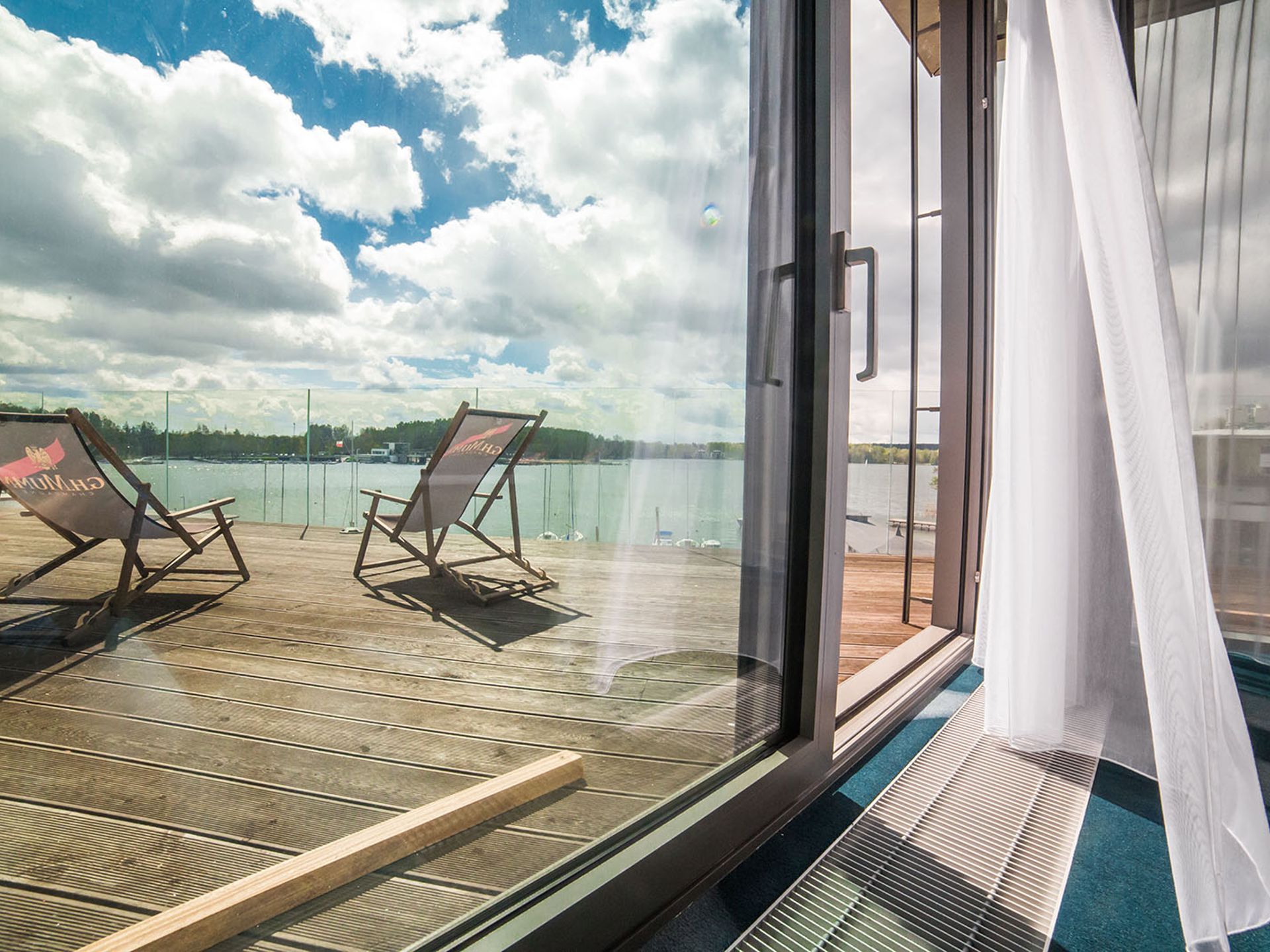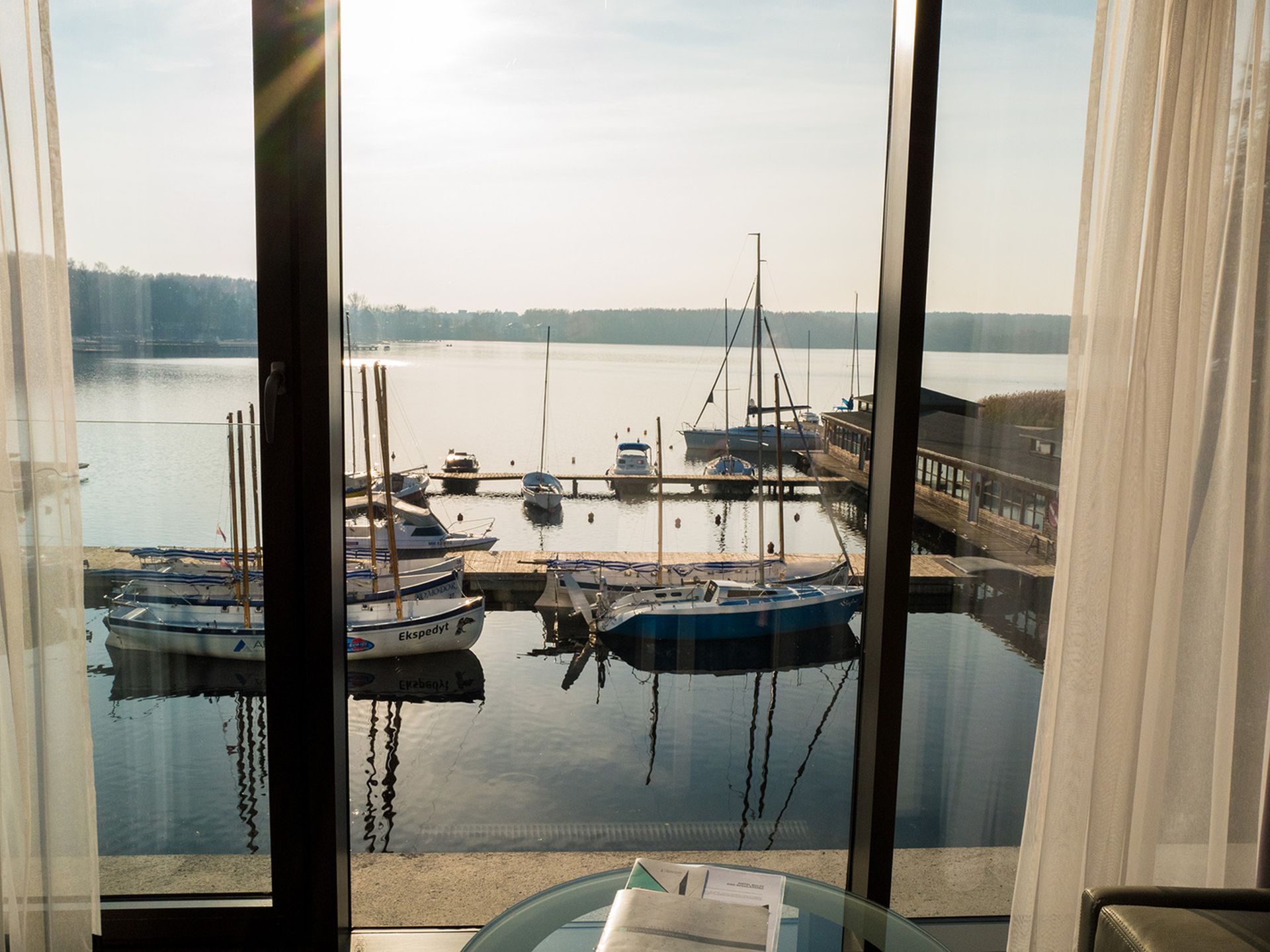 Najpiękniejszą ozdobą większości hotelowych pokoi jest niezwykły i malowniczy widok na jezioro Ukiel. Minimalizm i subtelna elegancja apartamentów podkreślają piękno otoczenia i pozwalają w komfortowych warunkach napawać się jego urokiem. Nowoczesne wnętrza zaskakują przytulnością, a ich aranżacja sprzyja atmosferze wypoczynku. 12 z pokoi posiada prywatne molo.
